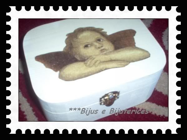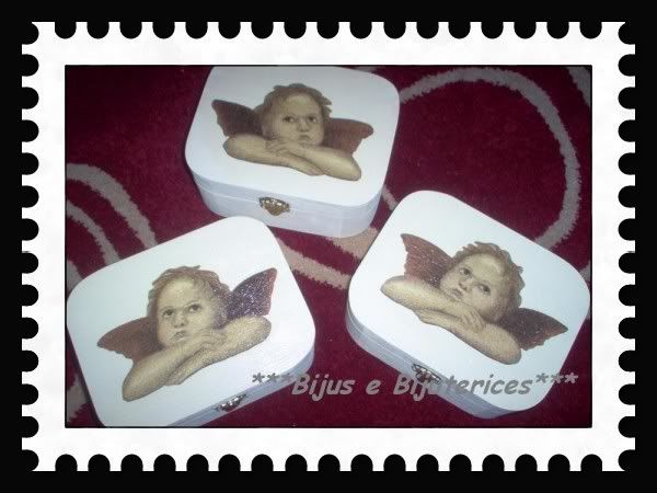 As caixinhas de madeira ja pintadas com uma cor base beje, e com decoração de anjo na tecnica Arte Aplicada